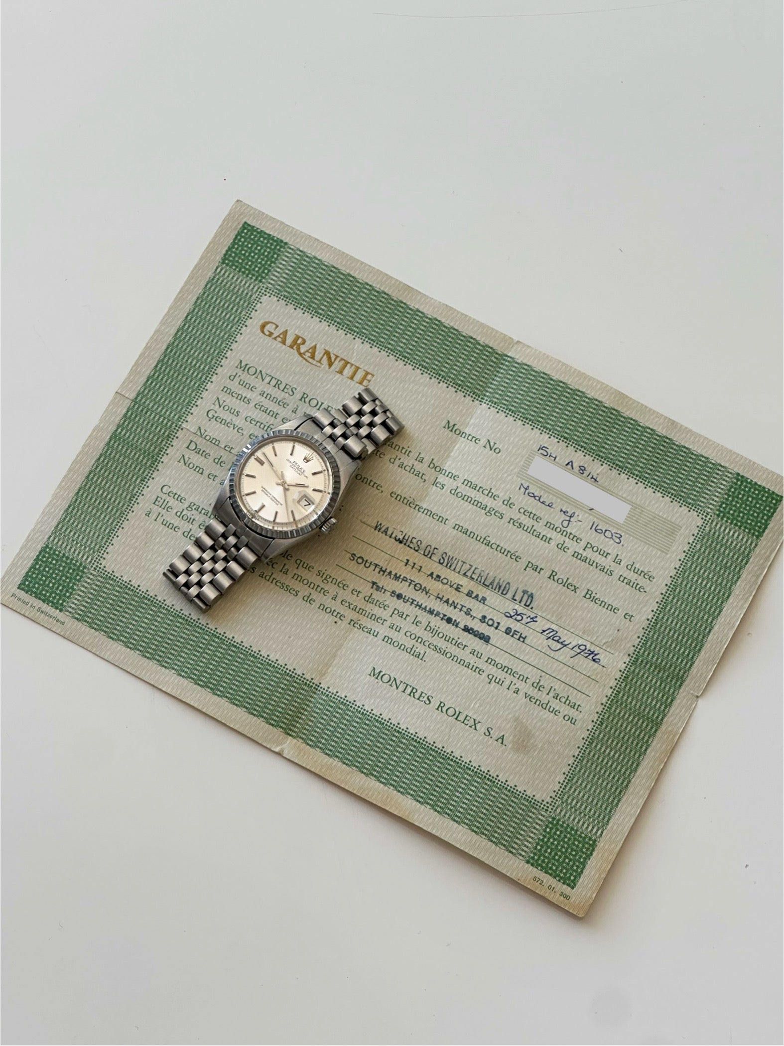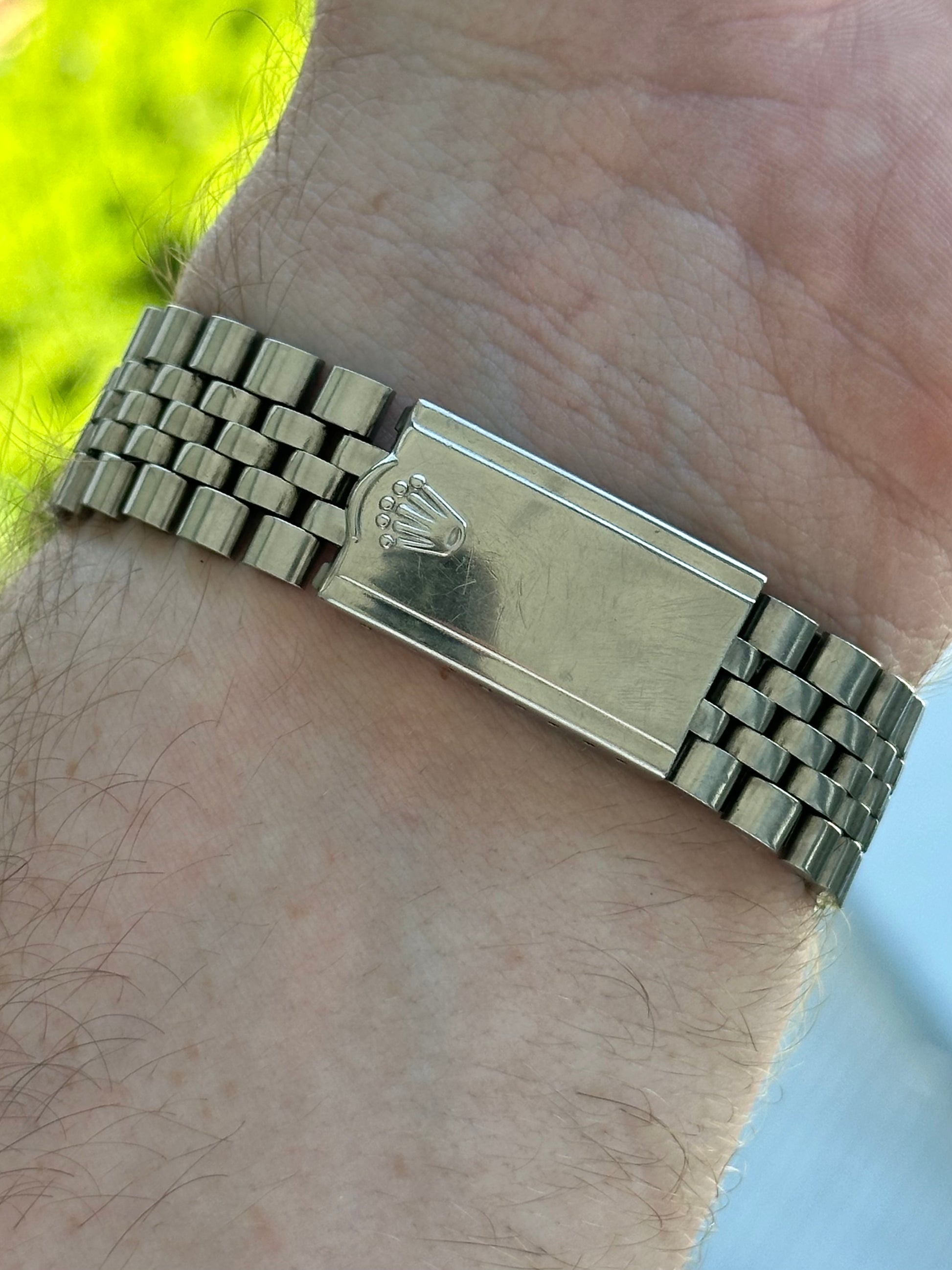 What’s for sale is a beautiful example of a Rolex Datejust 1603 with a lot of special features. This particular example has a sigma dial meaning that the hour markers are white gold. The jubilee bracelet is a super rare USA made bracelet featuring oval links. To top it off this watch comes with its original hole punch papers from 1976. This watch is truly something special.